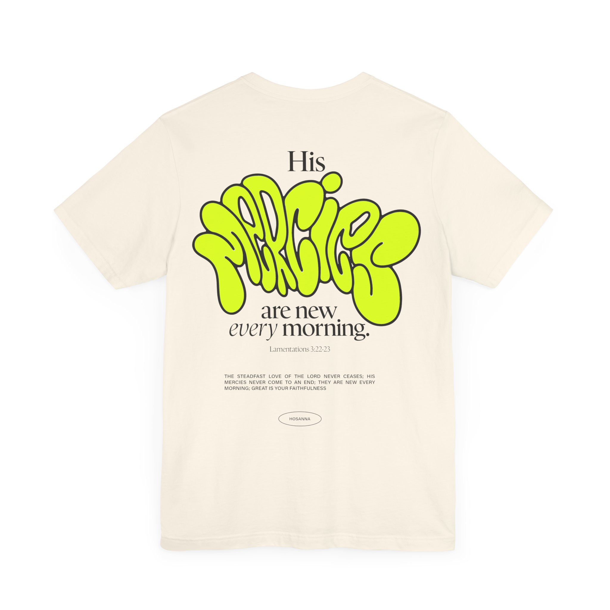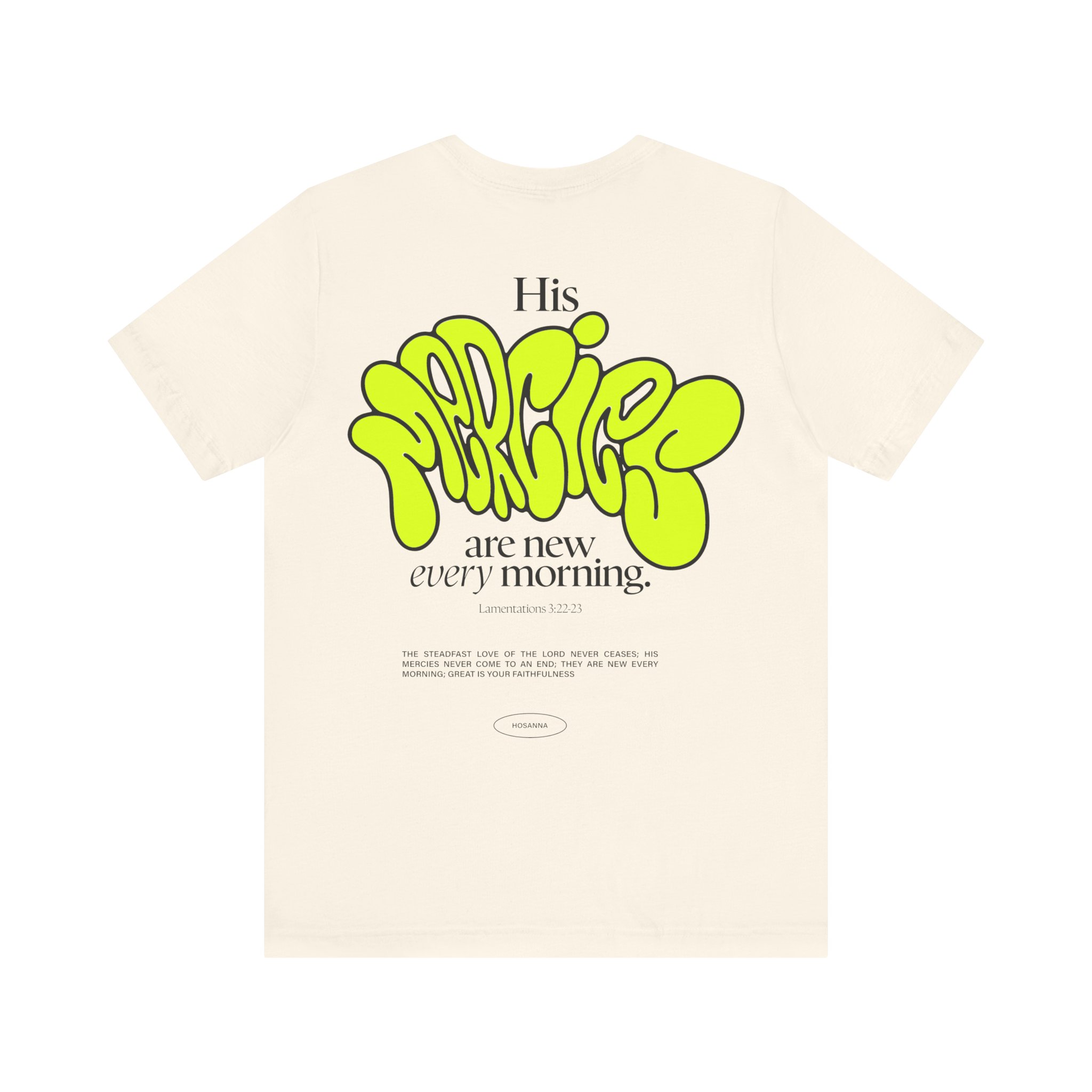 Embrace the fresh start each day brings with the “His Mercies Are New Every Morning” Short Sleeve Tee. Featuring a bold and playful font, this design highlights the comforting reminder from Lamentations 3:22-23. Perfect for those who cherish the promise of new mercies every day.